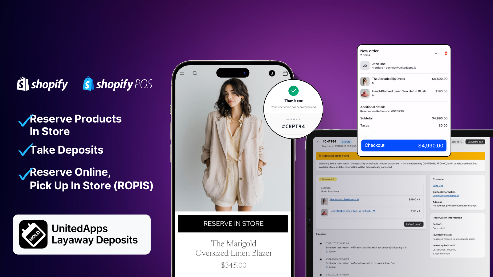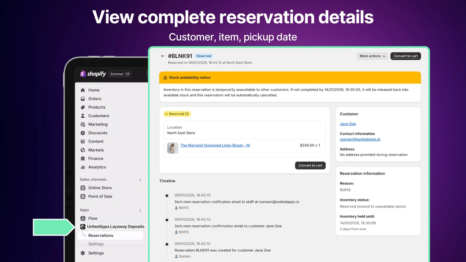 - Reserve products in Shopify POS with a single tap.
