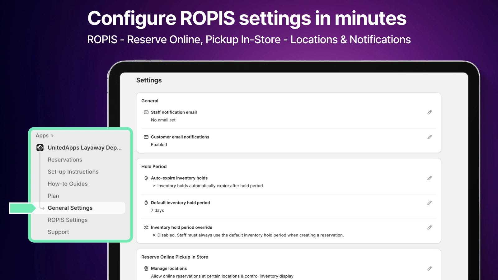 The reservation period is set in the admin control panel of the Shopify POS app online. By default, it’s set to seven days, but you can customize it to suit your needs. Currently, the same reservation period applies to all reservations across your stores, but we plan to introduce a feature that will allow you to set different periods for individual reservations in the future.